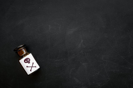 Dangerous addictions, dangerous entertainment. Poison. Bottle with skull and crossbones on black background top view.
