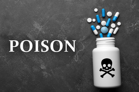 Bottle with Poison warning symbol and pills on gray textured background, top view