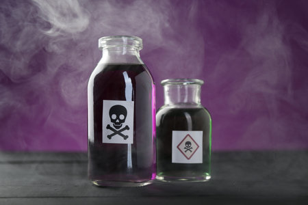 Bottles of poison with warning signs and smoke on black wooden table against purple background, closeup