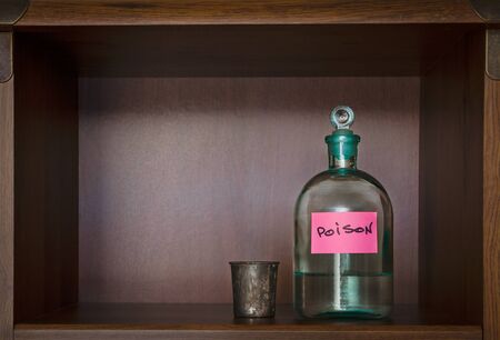 vial of poison with a hazard warning label, on a dark background, toning, short focus