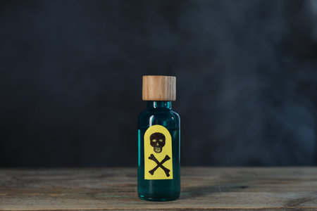 Bottle of poison with warning sign on wooden table against dark background with smoke