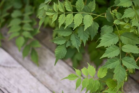 Branches with green leaves of campis creeper. Background image of green leaves on old wooden boards.