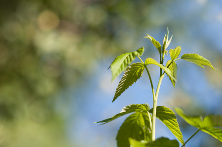 Bright green leaves of a young hops close-up