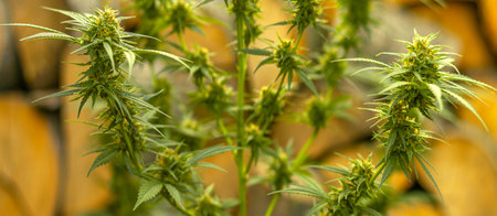 Ripe cannabis plant - hemp. Blooming female marijuana flower and leafs growing in homemade garden. Shallow depth of field and blurred background. Illuminated by sunlight. Close-up