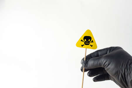 mortal danger sign in man's hand with black glove, on white