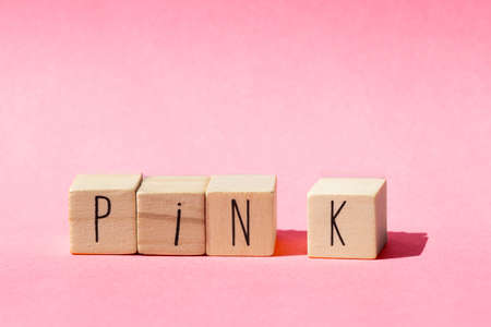 Wooden cubes lie in a row on pink background with the word Pink, Pastel colored pink natural concept