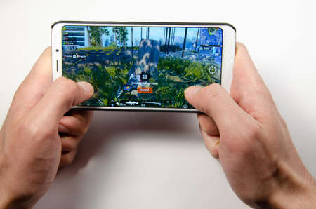April, 2019. Kramatorsk, Ukraine. The gameplay of the game PUBG G Mobile on a white smartphone in hand
