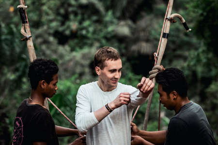 BALI, INDONESIA - MAY 16, 2018: Young man swinging in the jungle rainforest of Bali island, Indonesia. Swing in the tropics. Swings - trend of Bali island.