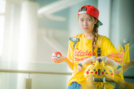 BANGKOK, THAILAND – August 14,2016: Trainer girl playing pokemon , pokemon ball ,Lighting with sun flare