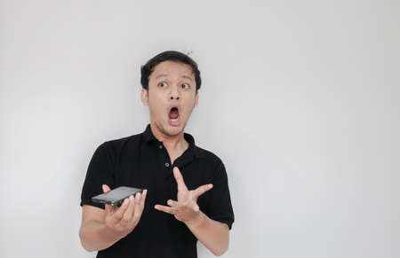 Wow face of Young Asian man shocked what he see in the smartphone on isolated grey background.