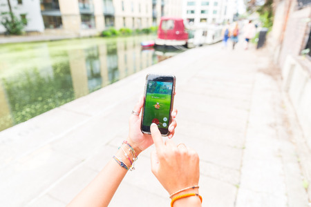 LONDON, UK - July 30, 2016: Woman playing with the current fashion app Pokemon go and trying to catch Magikarp on an Apple iPhone 6s while walking around the city