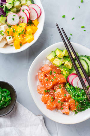 Fast and healthy food, lunch, nutrition concept. Fresh organic hawaiian salmon and tofu poke bowl with rice, seaweed, avocado, cucumber, mango on a modern kitchen table. Top view flat lay background