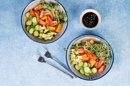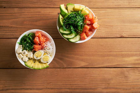 Raw Organic Poke Bowl with with rice, avocado, salmon, mango, cucumbers, chuka salad, quail eggs sweet onions and soy sauce two plates close-up on wooden background top view
