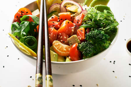 poke bowl with salmon, avocado, rice, Chuka Salad, sweet onions, quail eggs sprinkled with white and black sesame with chopsticks and soy sauce islated on white background.