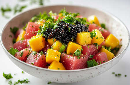 A vibrant salad featuring cubed tuna and mango, adorned with black caviar, served on a bed of greens in an aesthetically pleasing bowl against a minimalist backdrop.