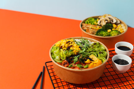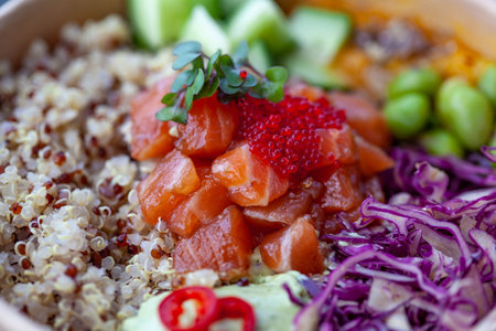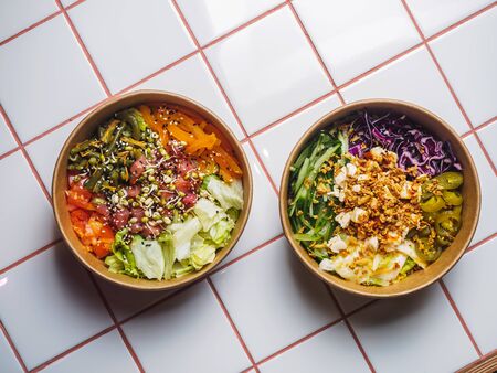 Close up of delicious and healthy poke bowls with salmon and vegetables served in a restaurant.
