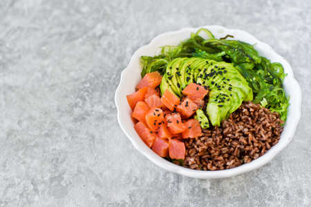 Salmon salad, avocado, brown rice, seaweed. Gray background, side view, space for text