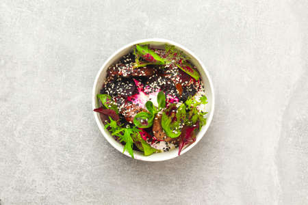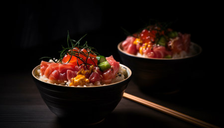 Raw Organic Ahi Tuna Poke Bowl with Rice and Veggies
