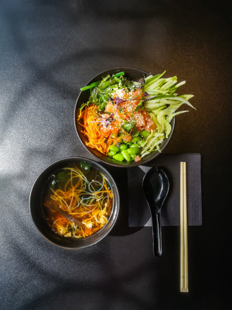 Japanese-style lunch. Bowl with fresh salmon, carrots, cucumbers, green beans, chukka lettuce. Shiro miso soup. Wooden chopsticks and an Asian spoon on a black table at an Asian restaurant.