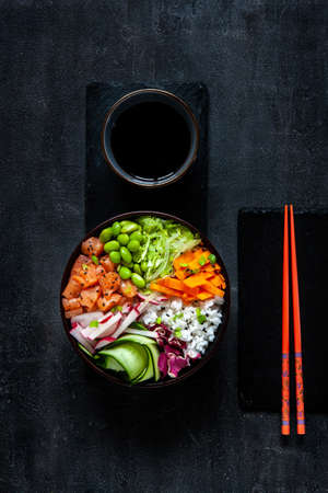 Colorful Asian trendy food, sushi poke bowl with rice, cucumber, salmon, carrot, edamame beans and soy sauce. top view, close up