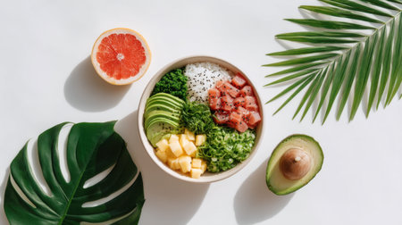Discover a vibrant healthy bowl featuring fresh avocado, grapefruit, and tropical fruits. Perfect for those seeking a nutritious and aesthetically pleasing meal.