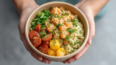 A close-up shot showcases a colorful poke bowl held by hands, emphasizing fresh ingredients. The bowl features a variety of textures and hues. The composition, lit by soft light, suggests an intimate setting. This image is suitable for various commercial uses, including food-related marketing and editorial content.
