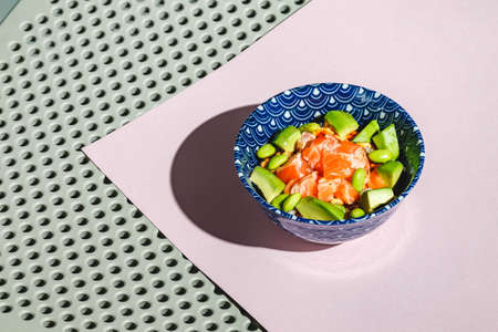 Poke bowl with rice, avocado, edamame beans and smoked salmon. Hard light, deep shadow