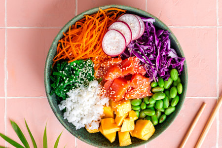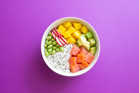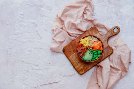 Hawaiian poke bowl with rice, salmon, avocado, radish, edamame and mango. Healthy eating. Diet.