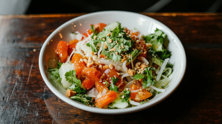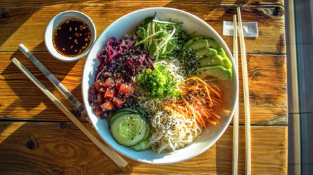 A vibrant bowl of fresh Asian cuisine showcases colorful ingredients like tuna, vegetables, and sauce on a rustic wooden table, ideal for healthy eating.