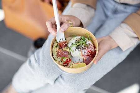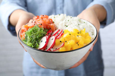 Woman hand hold Poke bowl, traditional Hawaiian raw fish salad with rice, avocado, cucumber and radish