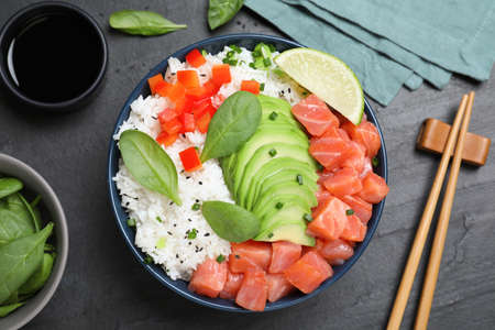 Hawaiian salmon fish poke bowl with rice, avocado, paprika, sesame seeds and lime. Buddha bowl. Diet food. Top view