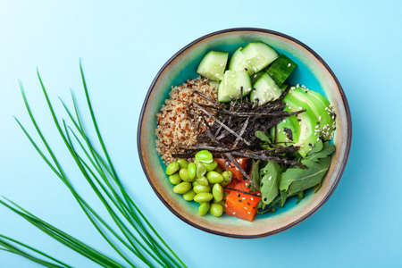 Vegetarian quinoa bowl, cucumber, avocado, green peas, nori, arugula