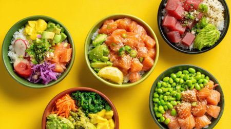 Colorful assortment of poke bowls with fresh ingredients on yellow background.