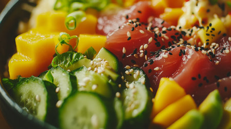 Colorful poke bowl with fresh tuna, mango, cucumber, and sesame seeds served in black dish