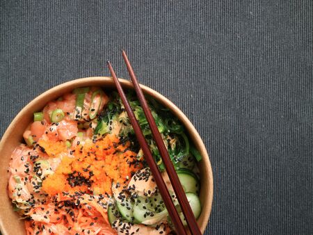 Raw Organic Ahi Salmon Poke Bowl. Top view