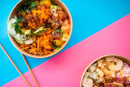 Flat lay composition with prawn poke and salmon poke on a blue and pink background with chopsticks