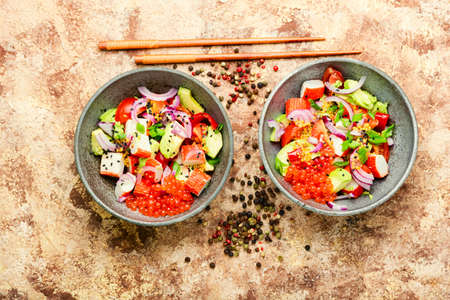 Poke bowl, traditional Hawaiian raw fish salad with rice, avocado, cucumber and radish