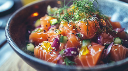 A beautifully arranged fresh salmon salad featuring vibrant vegetables and aromatic herbs in a dark bowl on a wooden table, perfect for healthy dining.