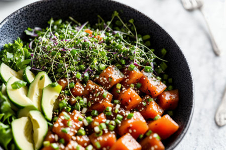 Detailed close-up of vegan poke bowl garnished with microgreens and a sprinkle of nori strips, focusing on the freshness and vibrant garnish. AI generated.