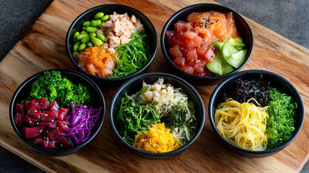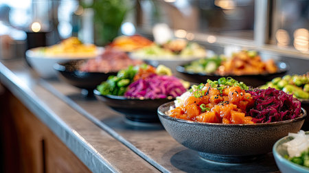 Overhead view of a vibrant poke bowl bar, showcasing a variety of fresh ingredients arranged in colorful bowls, ready for customization