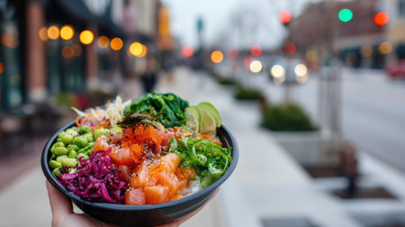 Hand holding a poke bowl with fresh ingredients, ready for takeout, against a city street background