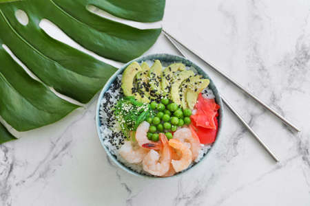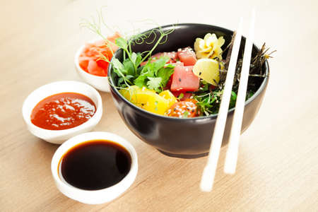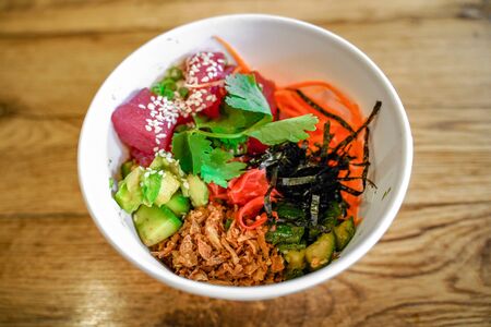 Poke bowl, Traditional Hawaiian food, prepared with Tuna Fish, rice and vegetables