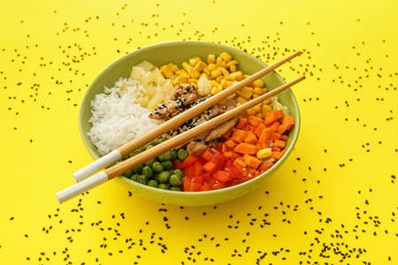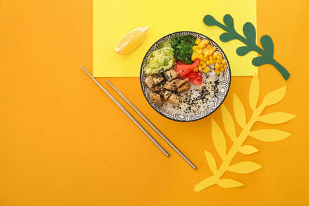 vegetarian dish. Poke bowl with tofu. top view on white and yellow background