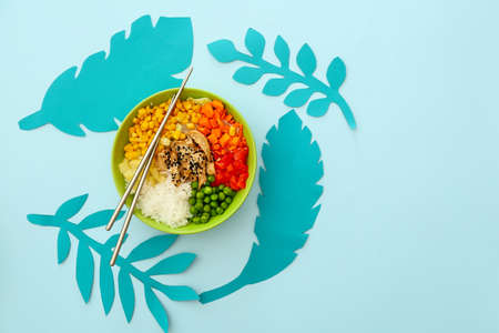 Traditional Hawaiian Poke Bowl prepared with Tuna Fish, rice and vegetables, with copy space