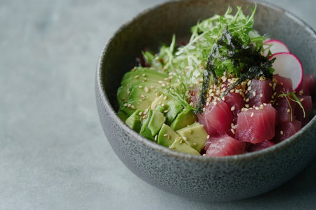 Gray bowl filled with colorful poke ingredients including tuna, avocado, sesame seeds, nori, and radish, creating a visually appealing healthy meal