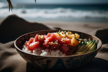 Hawaiian tuna poke bowl with rice and avocado on the beach