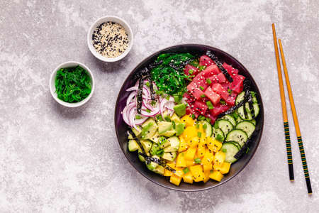 Hawaiian tuna poke bowl with seaweed, avocado, mango, cucumber, top view.