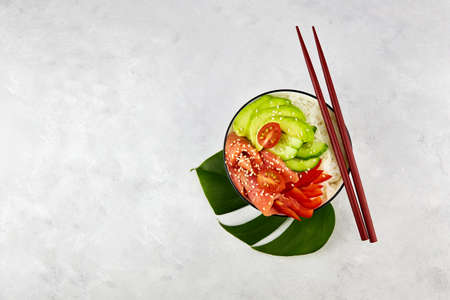 Poke bowl with avocado, salmon, cucumber, pepper and cherry tomatoes. Hawaiian diet food with fish.