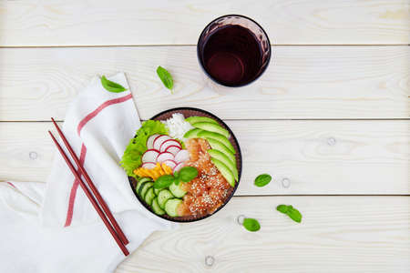 Poke bowl with salmon, rice, avocado, cucumber, mango, herbs and glass of water on wooden background. Hawaiian ahi. Top view. Close-up.