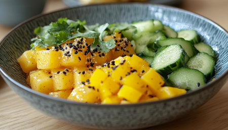 Fresh Mango and Cucumber Salad with Cilantro and Sesame Seeds, a Refreshing Vegan Lunch Option.